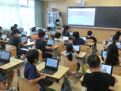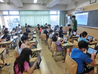 3-3の教室では、一人一台のタブレットを使ってプログラミングの学習をしていました。