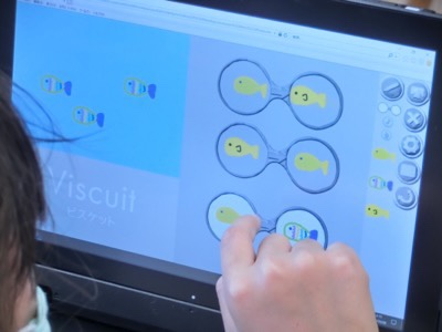 Viscuitというプログラミングソフトを使って、キャラクターを動かすプログラムを作っています。この子は、魚が動いたり色が変わったりするように工夫しています。