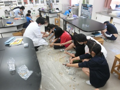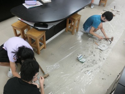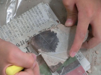 教材として購入した石の中に木の葉の化石が埋もれています。それを割って見つける作業です。