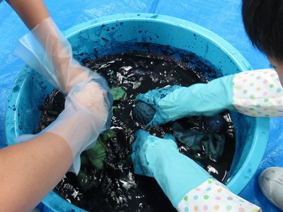 藍染め液の中に縛ったTシャツを入れてよく染み込ませます。