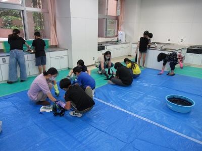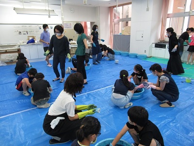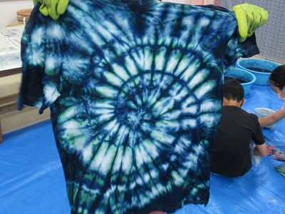 今日は、例年運動会の「天沼伝」で高学年が着用する藍染めTシャツ(通称あまT)を5年生が染めました。学校支援本部(AW)がコーディネートし、保護者のみなさんがお手伝いをしてくれます。