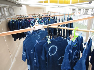 染め上がったTシャツは、屋上の出口のところに干しました。いい色に染まっています。伝統の「あまT」の完成です。