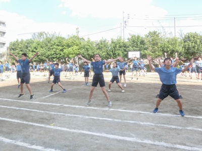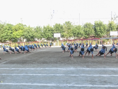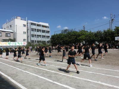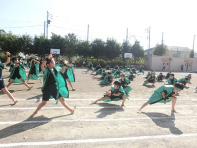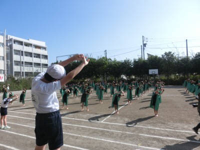 1時間ごとに学年別に校庭に登場します。それぞれの学年で準備運動として「天沼エクササイズ」をしました。係は高学年の子どもたちがクラスごとに担当しています。