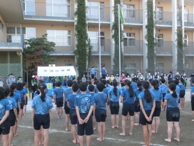 閉会式はそれぞれの学年ごとにアリーナで行いましたが、最後の6年生は校庭で行いました。天沼伝をやり切った思いのこもった6年生代表の言葉は、保護者の方々から大きな拍手をいただきました。