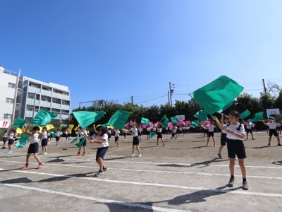 次は、3年生の「四色炎舞」。大きな動作で一斉にフラッグを振る様子は壮観でした。