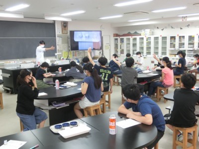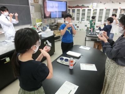 理科室では6-3が水溶液の性質について調べる実験をしていました。ビーカーに入れられた水溶液の匂いを手であおいで嗅いでいます。