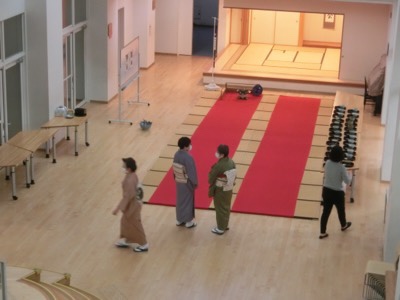 6年間の茶道体験の集大成として、6年生が「野点」を行います。風のテラスで実施する予定でしたが、残念ながら今日は雨。センターコートに緋毛氈を敷いて行います。「野」じゃないですけど仕方ありません。