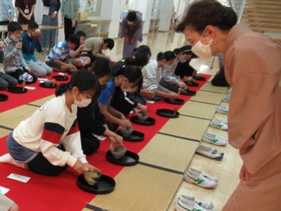 担任の山口先生が、緊張した表情で御点前をいただくお手本を示しました。