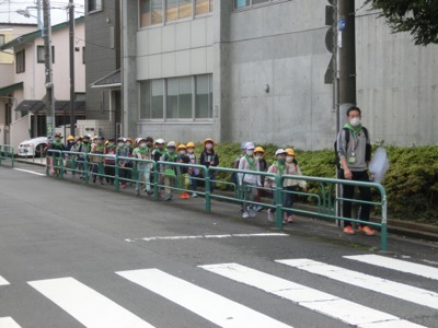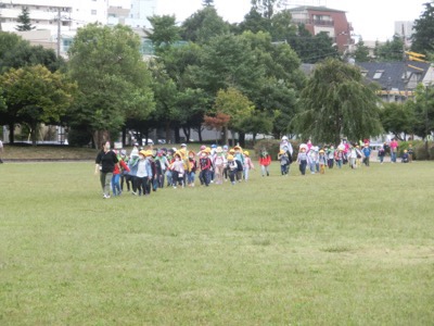 桃井原っぱ公園までは、歩いて30分ほど。2年生が1年生の手を引いて歩きました。