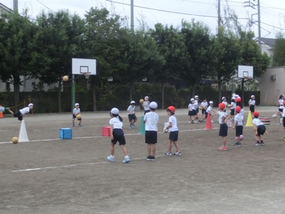 運動会は終わりましたが、体育の学習内容は引き続き授業の中で取り組んでいます。これは1-1と1-2の体育です。校庭の真ん中に並べた的にボールを投げる運動をしています。