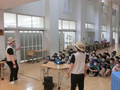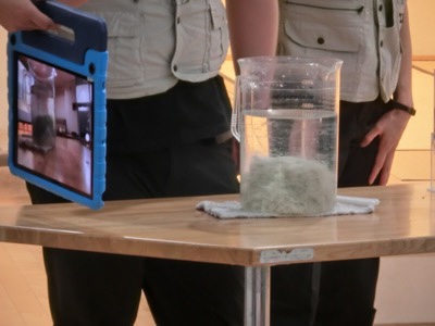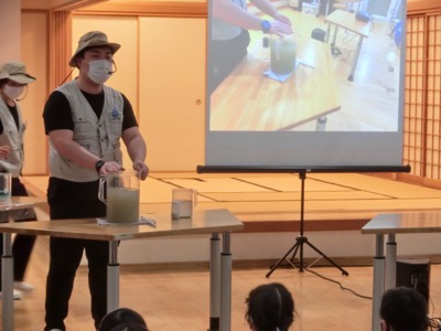 さらに、川から取り入れた水の汚れを取り除く実験もします。例年はグループごとに子どもたちが実際にやってみるのですが、今年はコロナウイルス対応のため、前で実験を見せてくれました。