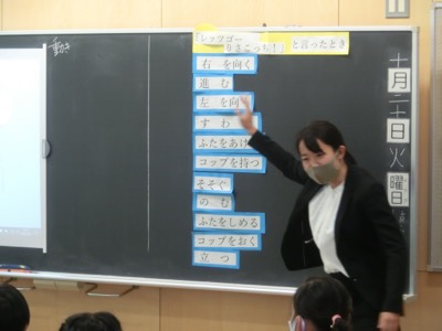 タブレットでプログラミングをする前に、目的とする動きをステップごとに命令していくシミュレーションをしました。舩越先生を動かす「プログラム人間」です。子どもたちは大喜びで先生を動かしていました。