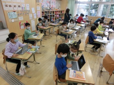 2-1は、タブレットて昨日の生活科見学のまとめをしていました。