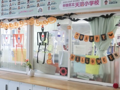 今週末はハロウィンですね。事務室のみなさんが作っている事務室前のディスプレイもハロウィン仕様になっています。