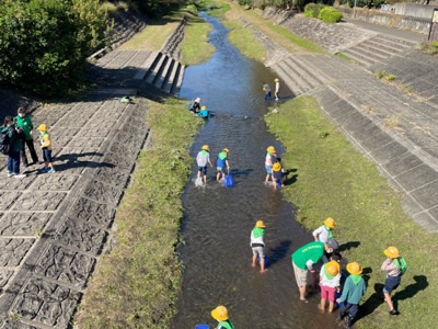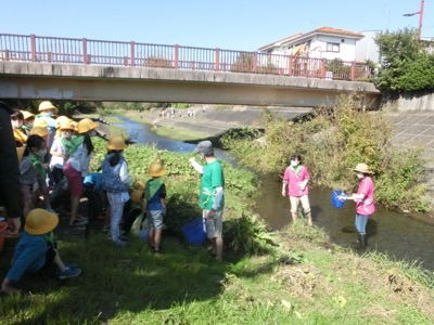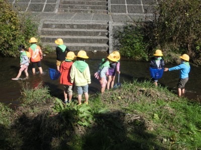こちらは川で遊ぶ活動です。スペシャルゲストティーチャーの松川先生が魚やエビの捕まえ方を教えてくれました。