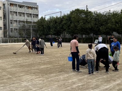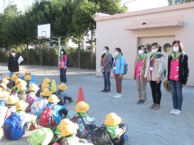 校庭に集合し、一日お世話になる学校支援本部(AW)のみなさんに挨拶をしました。
