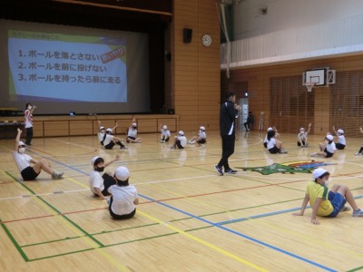今日は、ラグビートップリーグのNTTコミュニケーションズ「シャイニングアークス」の選手をゲストティーチャーに迎え、5年生がラグビーを体験しました。オリンピック・パラリンピックに向けた取り組みの一つです。最初の講義では、国際理解・国際協力の大切さについてお話を伺いました。