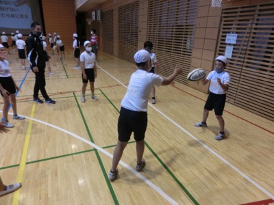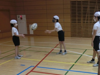 慣れないラグビーボールは、投げるのも捕るのもなかなか難しいですね。