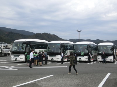 密を避けるため、観光バス4台に分かれて富士山に向かいます。