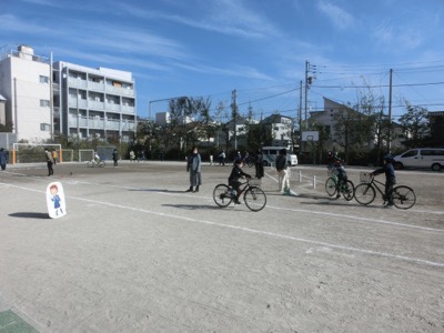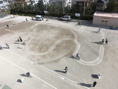 校庭にはコースが描かれ、交通ルールを守って自転車に乗る練習をしました。保護者の方々がコースの要所に立って指導をしてくれます。