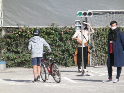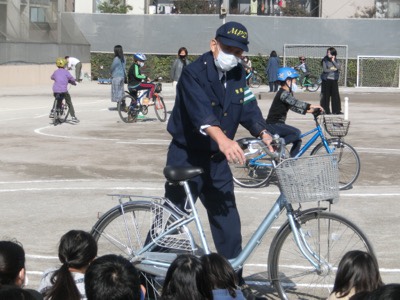 校庭で4年生が自転車安全教室を実施しました。はじめに、警察署の方が交通ルールについてお話をしてくださいました。自転車が「止まれ」の標識を守らず事故になることが多いので気をつけなければいけません。