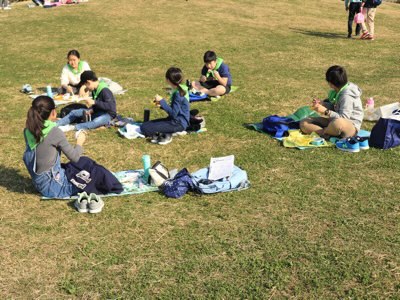 鎌倉海浜公園に到着し、お弁当です。暖かく、風もないのでのどかなランチタイムです。