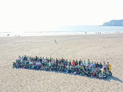 お弁当のあと、由比ヶ浜の海岸に出て記念撮影をしました。ドローンを飛ばして空撮しました。ちゃんと事前に藤沢土木事務所と海上保安庁に申請してあります。
