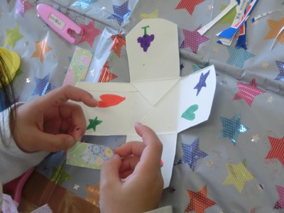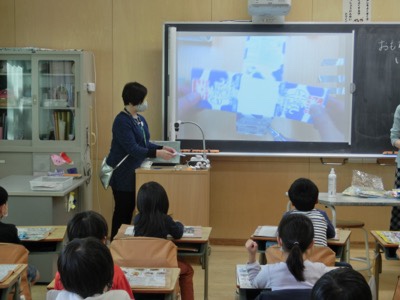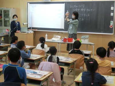 この前、2年生のおもちゃ作りをおしえてくださったデザイナーの池谷先生が今日は1年生におもちゃ作りを教えてくださいました。これは1-3です。