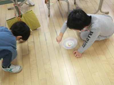 表と裏にペットボトルキャップをセロファンテープで貼り付けると、コマの完成です。早速回してみました。