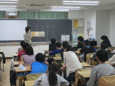 今日は6年生の「おはなし会」もありました。本を読まずにお話しする「素話」は、表情や口の形が見えることも重要なので、透明のシートを貼ったスクリーンの向こうでお話しします。これは6-1です。