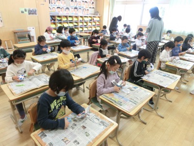 切った牛乳パックに色をつけていきます。これは1-2の様子です。学校支援本部(AW)のみなさんがお手伝いをしてくださいました。