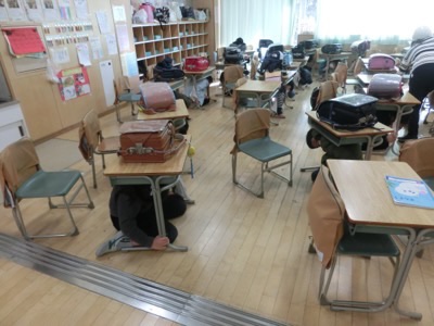 教室では、子どもたちが机の下にもぐっていました。これは2-1です。