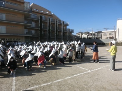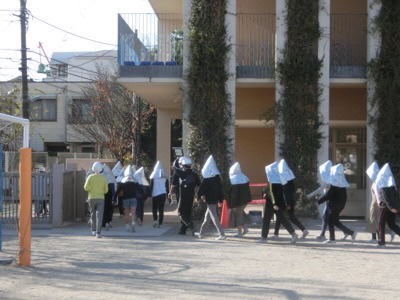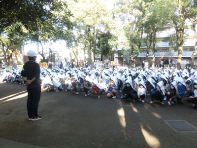 校庭に集合して人員確認をしました。さらに、地震で起きた近隣の火災のために、校庭や校舎も類焼の危険があるということで、弁天池公園に二次避難をする訓練に移りました。