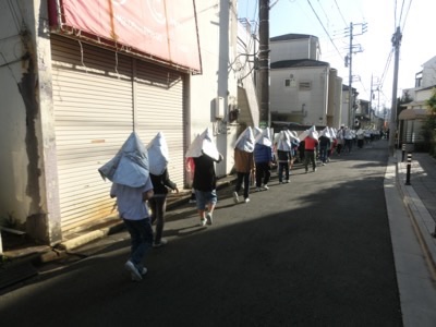 静かに道を歩いています。避難訓練の時におしゃべりをする子はほとんどいません。