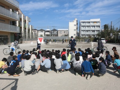 校庭で4年生が自転車安全教室を実施しました。はじめに、警察署の方が交通ルールにつ...