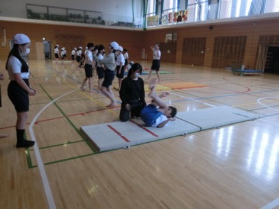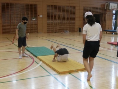 後転は難しいので、最初は先生が補助をして回れるように指導しています。