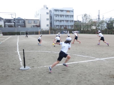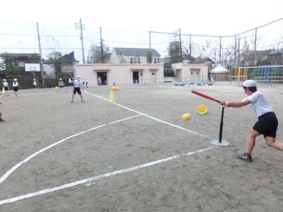 子どもたちは校庭で元気に体育をしています。ということで、今日は体育の授業をご紹介。これは4-1がティーボールをしている様子です。