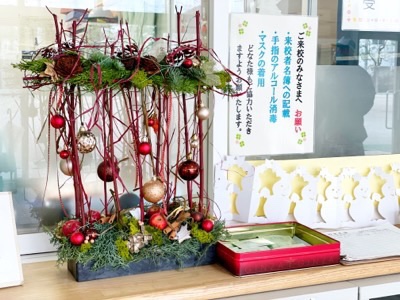 今日は役員校長会で出張のため、子どもたちの様子が撮れませんでした。申し訳ありませんが、校内の装飾の写真でご容赦ください。事務室前は事務職員がディスプレイしています。