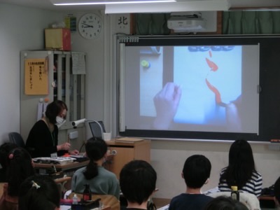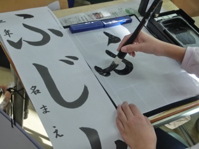 2年生までは硬筆の書き初めでした。毛筆の始筆終筆など、日置先生が手元を映しながら教えてくださいます。