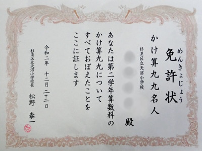 私から出した問題に全て答えられたら、「九九名人免許状」が与えられます。合格した子は免許状をもらって嬉しそうに帰っていきました。