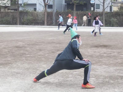 担任の大中先生が、子どもたちの中に入る前に念入りに準備運動をしています。