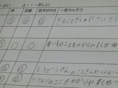 聞き手が「声」「目線」「話すはやさ」などの観点で感想を書きます。