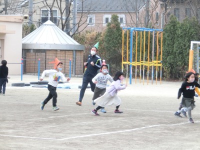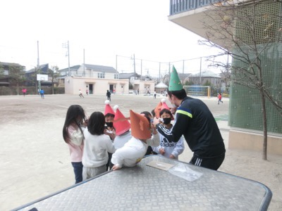 校庭に出てきたのは2-2です。可愛い帽子をかぶって鬼ごっこをするようです。