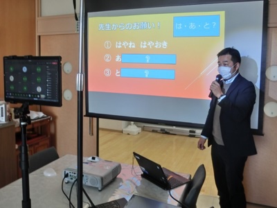 生活指導主任の中島先生からのお話です。お天気キャスターみたいですね。
