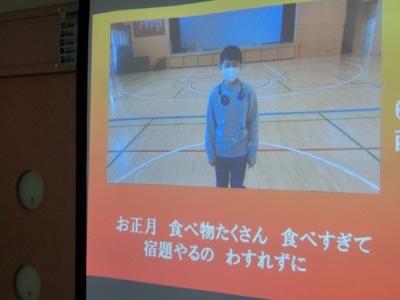 全校がアリーナに集まっての終業式はまだできません。2学期の終業式もMicrosoft Teamsを使ったオンライン形式で行いました。校長室前がスタジオのようにセッティングされています。私の話のあと、児童代表の言葉として、今日は3年生とこだま学級の各クラス代表が2学期の振り返りと3学期に頑張りたいことを発表しました。