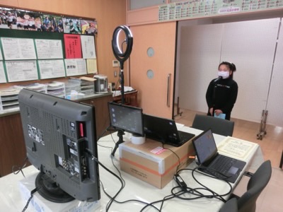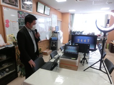 始業式は校長室前をスタジオ的にセッティングして、Microsoft teamsを使用したオンラインで行います。司会は副校長先生です。