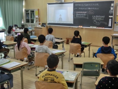 各クラスでは、静かに画面を見て話を聞いています。これは2-1です。