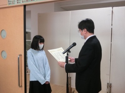 始業式のあと、読書感想文コンクールで杉並区代表として東京都のコンクールに出品された児童の表彰をしました。