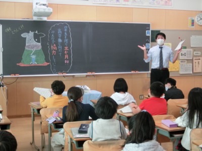 始業式が終わると、各クラスでの指導が始まります。4-2では、学年だよりを見ながらこれからの予定について確認していました。