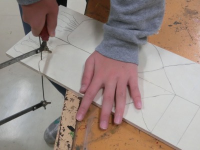 図工室では、6-4が作品を作っていました。「1枚の板を無駄なく使って長く使えるものを作ろう」という活動です。電動糸鋸盤を使って板を切り抜いています。